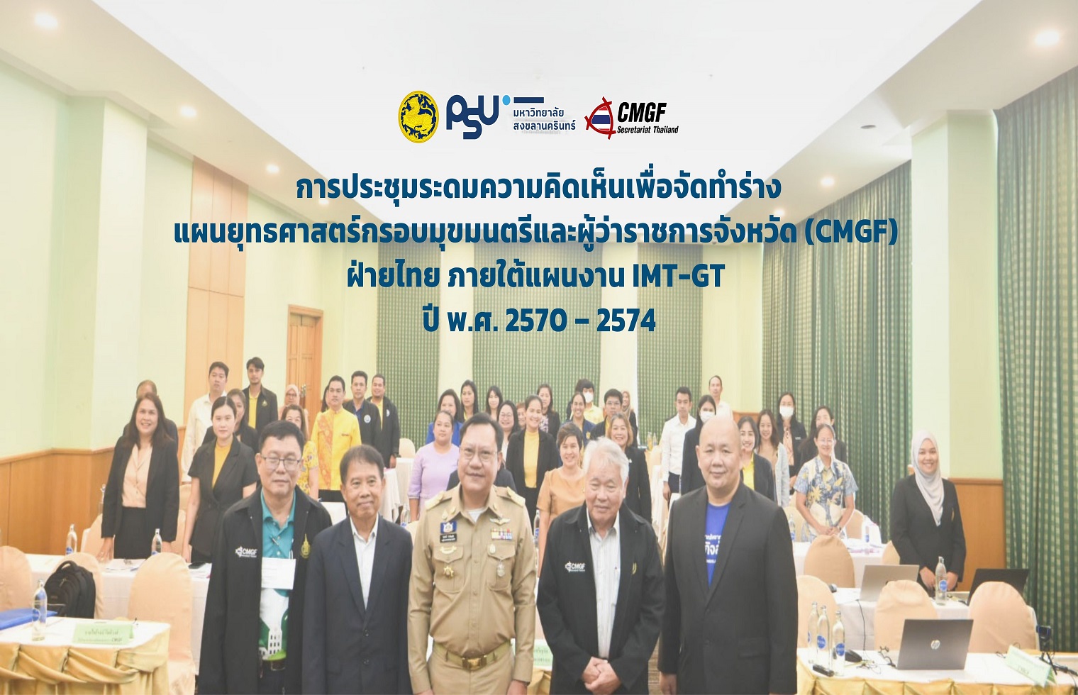 การประชุมระดมความคิดเห็นเพื่อจัดทำร่างแผนยุทธศาสตร์กรอบมุขมนตรีและผู้ว่าราชการจังหวัด (CMGF) ฝ่ายไทย ภายใต้แผนงาน IMT-GT ปี พ.ศ. 2570-2574 (ภาคใต้ตอนบน) เมื่อวันที่ 16 มิถุนายน 2568 สำนักงานฝ่ายเลขานุการฯ CMGF ได้จัดการประชุมระดมความคิดเห็นเพื่อจัดทำร่างแผนยุทธศาสตร์กรอบมุขมนตรีและผู้ว่าราชการจังหวัด (CMGF) ฝ่ายไทย ภายใต้แผนงาน IMT-GT ปี พ.ศ. 2570-2574 ณ โรงแรมไดมอนด์พลาซ่า สุราษฎร์ธานี โดยได้รับเกียรติจากนายธีรุตม์ ศุภวิบูลย์ผล ผู้ว่าราชการจังหวัดสุราษฎร์ธานี ซึ่งได้มอบหมายให้นายวิทศักดิ์ จำเริญนุสิต รองผู้ว่าราชการจังหวัดสุราษฎร์ธานี เป็นประธานเปิดการประชุมโดยมีผู้เชี่ยวชาญนำการประชุม ประกอบด้วย ผศ.ดร.นิเวศน์ อรุณเบิกฟ้า ผู้อำนวยการสำนักพัฒนาทรัพยากรมนุษย์และพันธกิจสังคม มหาวิทยาลัยสงขลานครินทร์ ผศ.ดร.อำนวย สิทธิเจริญชัย ผู้เชี่ยวชาญเกี่ยวกับแผนงาน IMT-GT คุณไพโรจน์ โพธิวงศ์ ที่ปรึกษาสำนักงานฝ่ายเลขานุการฯ CMGF มหาวิทยาลัยสงขลานครินทร์ และ รศ.ดร.ประวิทย์ โตวัฒนะ ผู้เชี่ยวชาญด้านการจัดการสิ่งแวดล้อมการประชุมครั้งนี้มีจุดประสงค์หลักเพื่อจัดทำร่างแผนยุทธศาสตร์ฝ่ายไทยที่สอดคล้องกับแผนการดำเนินงานระยะห้าปี พ.ศ. 2565-2569 (IB 2022-2026) และวิสัยทัศน์ IMT-GT พ.ศ. 2579 (IMT-GT Vision 2036) นอกจากนี้ ยังมุ่งเน้นการกำหนดทิศทางและเป้าหมายการพัฒนาในระดับพื้นที่ให้มีความเป็นรูปธรรม โดยสามารถบูรณาการยุทธศาสตร์ระดับชาติ แผนพัฒนาจังหวัด และกลยุทธ์การพัฒนาต่างๆ ให้มีความเชื่อมโยงกับการดำเนินงานของแผนงาน IMT-GT อย่างมีประสิทธิภาพ การประชุมยังเป็นเวทีสำคัญในการเสริมสร้างกลไกการทำงานร่วมกันระหว่างภาครัฐ ภาคเอกชน และภาคการศึกษาในระดับจังหวัด กลุ่มจังหวัด และภูมิภาค เพื่อนำไปสู่การขับเคลื่อนการดำเนินงานที่มีประสิทธิภาพและยั่งยืน รวมทั้งส่งเสริมบทบาทของมุขมนตรีและผู้ว่าราชการจังหวัดในฐานะผู้กำหนดทิศทางการพัฒนาในระดับพื้นที่และเป็นกลไกหลักของฝ่ายไทยในการขับเคลื่อนแผนงาน IMT-GT ร่วมกับประเทศสมาชิกอื่น