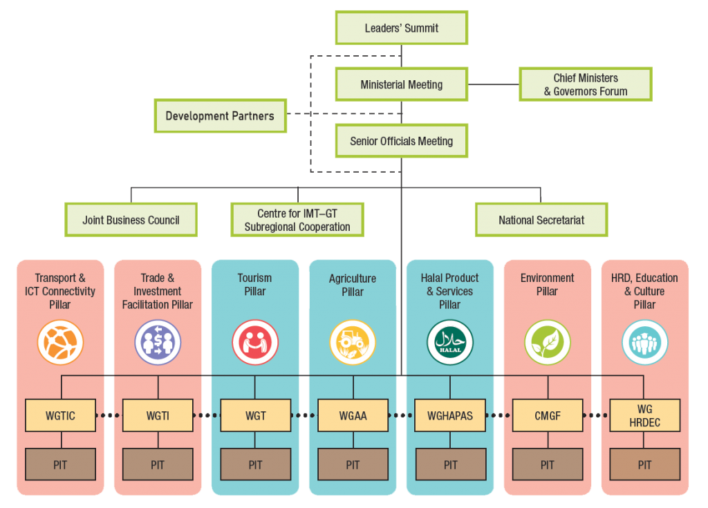การประชุมสุดยอดผู้นำ IMT-GT เป็นกลไกกำหนดนโยบายระดับสูงสุดของอนุภูมิภาค มีหน้าที่ในการกำหนดทิศทางเชิงยุทธศาสตร์ เสริมสร้างฉันทามติในประเด็นสำคัญด้านการพัฒนาเศรษฐกิจและสังคม ตลอดจนกำกับและส่งเสริมความร่วมมือและการบูรณาการระหว่างประเทศสมาชิก นอกจากนี้ การประชุมยังทำหน้าที่ยืนยันเจตจำนงทางการเมืองในระดับสูงสุด เพื่อให้การดำเนินงานภายใต้กรอบความร่วมมือ IMT-GT มีความสอดคล้องกับวาระการพัฒนาระดับภูมิภาคและระดับสากล ทั้งนี้ ผลการประชุมจะเป็นกรอบกำหนดวิสัยทัศน์และทิศทางการพัฒนาระยะยาวของอนุภูมิภาคโดยรวม