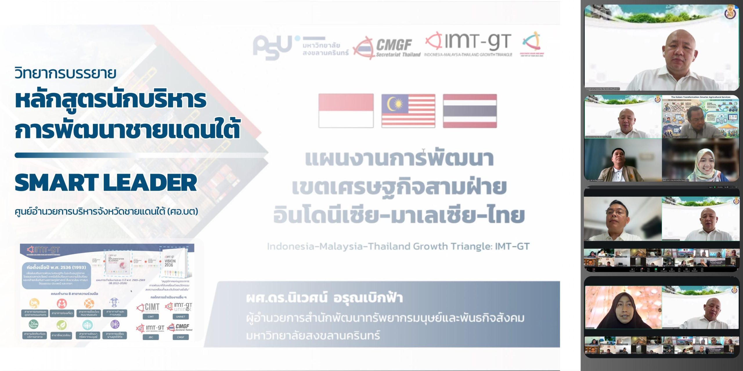 เมื่อวันนี้ (21 มกราคม 2569) เวลา 09.00 – 12.00 น. สำนักงานฝ่ายเลขานุการฯ CMGF นำโดย ผศ.ดร.นิเวศน์ อรุณเบิกฟ้า ผู้อำนวยการสำนักพัฒนาทรัพยากรมนุษย์และพันธกิจสังคม มหาวิทยาลัยสงขลานครินทร์ ได้รับเกียรติเป็นวิทยากรบรรยายในหัวข้อ “แผนพัฒนาเศรษฐกิจ 3 ฝ่าย (IMT-GT)” ผ่านระบบการประชุมทางไกล (Zoom Meeting)